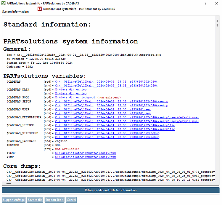 Use Help or ? Menu > Systeminfo/Support [System info/Support] (or F7 key) to open the 3Dfindit Systeminfo - 3Dfindit by CADENAS dialog window.