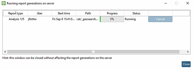 -> The analysis is started. You will be informed about the progress in the dialog box Ongoing report generation on the server [Running report generations on server].