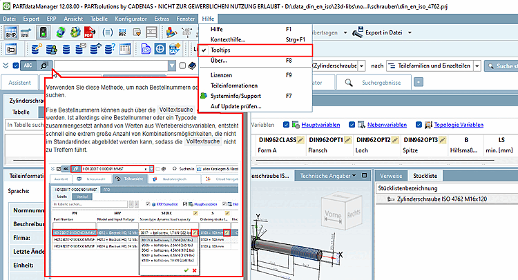 In the Help menu [Help], you will see a checkbox under Tooltips. Here you can switch tooltips on and off as required. You can currently find tooltips for the search methods and the input fields for Search in, Search for and the topology search.