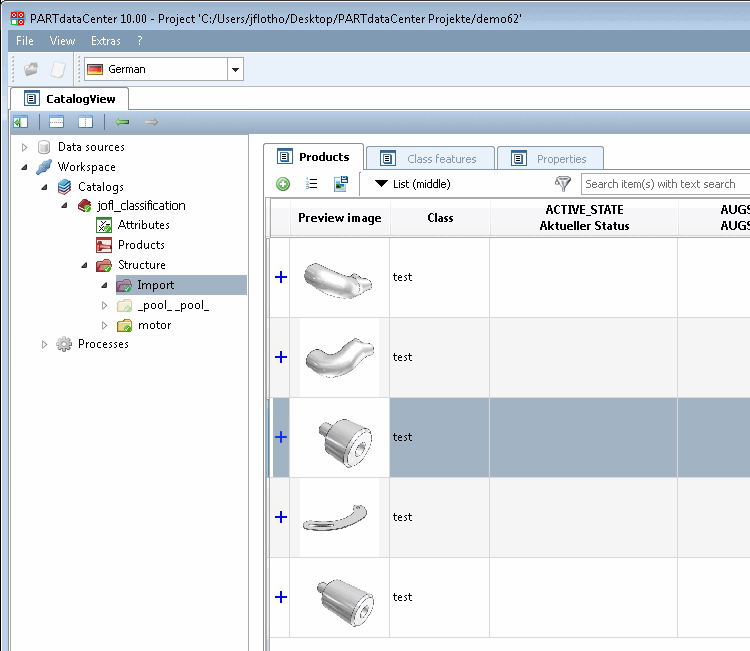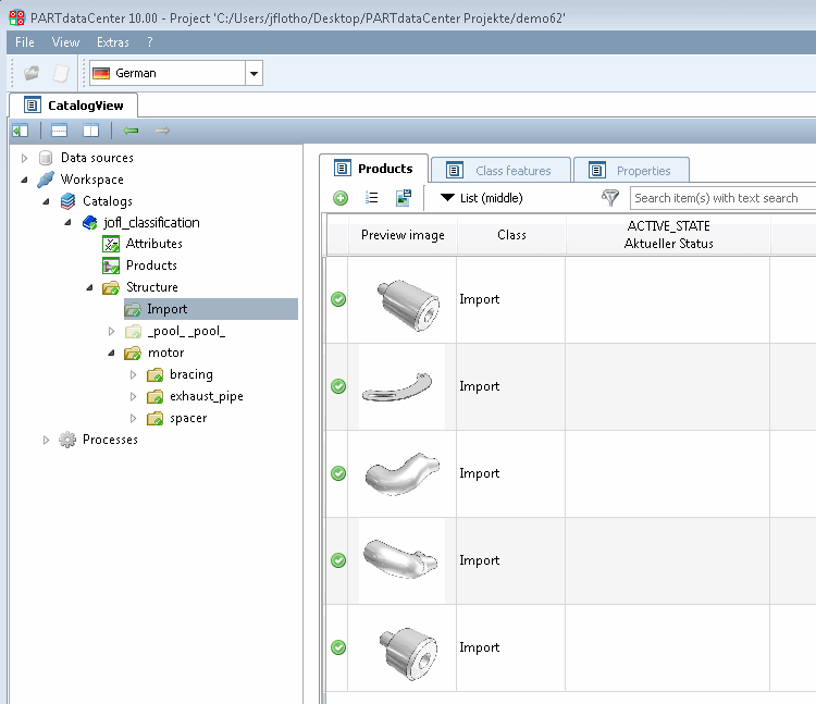 The import process now runs through and the imported components are displayed on the Products tab page. Each line is marked with a blue plus sign, which indicates that the products have not yet been uploaded to the server.