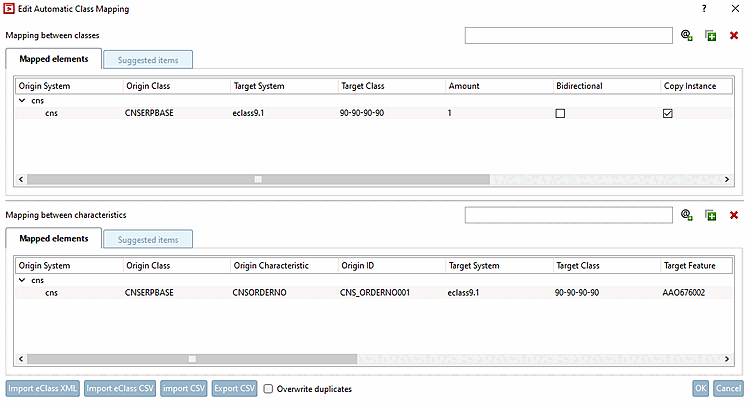 In the following example, a class feature of the CNS classification is to be mapped to a class feature of the eClass 9 .1 classification. This means that the class data is entered starting in the upper table ( mapping between classes [Mapping between classes] ) and then the characteristic data is entered in the lower table (mapping between characteristics [Mapping between characteristics] ).