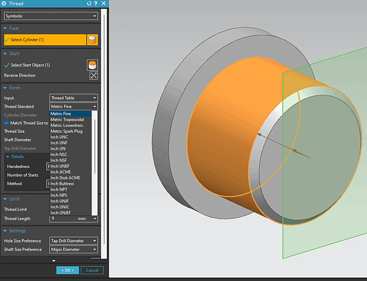 Up to now NX created Thread features from their raw parameters (diameter, pitch, depth, etc) and not their Standard table parameters.