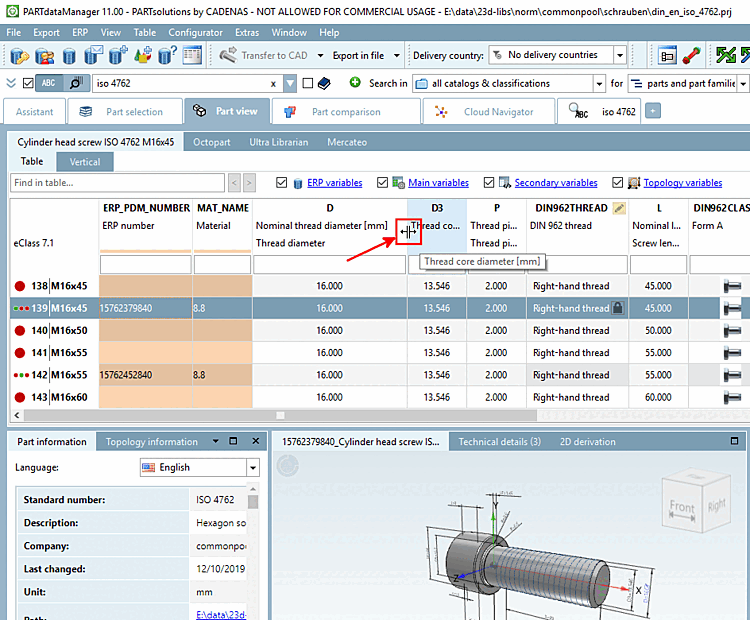 You can adjust the column widths of the characteristic attribute table from PARTdataManager customize. To do this, move the mouse over the border between two columns so that the handle appears. Then drag the width to the desired size. After changing a component or performing a search, the default width is displayed again.