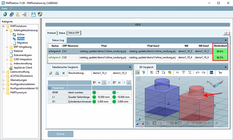 All projects with old, new path and old, new NB and geometric similarity are listed on the Status log Tabbed page.