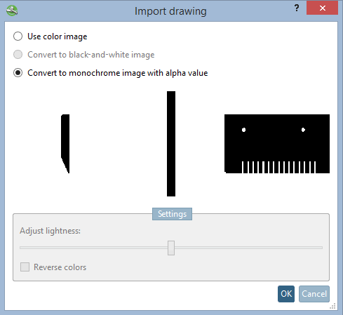 If the Convert to black and white image [Convert to black-and-white image] option is activated, you can optionally invert colors [Reverse colors] and adjust brightness [Adjust lightness] before importing.