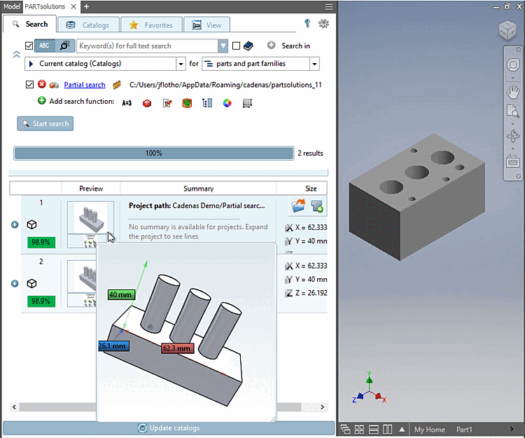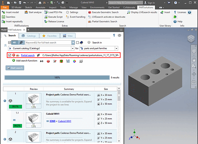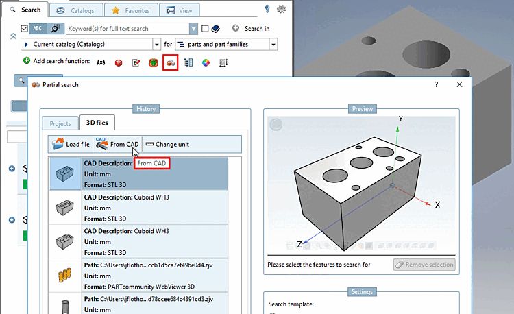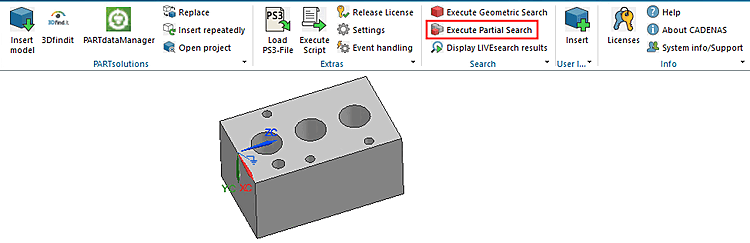 With some CAD systems, the feature selection can be made directly in the open component. If this option is available, you will find the Perform Partial Search [Execute Partial Search] command in the 3Dfindit menu. Otherwise, the functionality is available via Seamless or PARTdataManager (see below).
