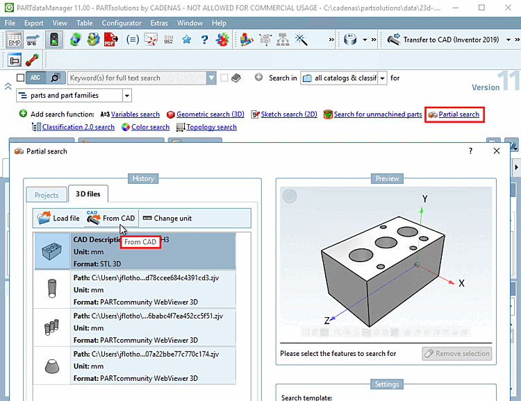 Alternatively (even if the Perform Partial Search [Execute Partial Search] command is not available), you can also open a part via Seamless. You will find the From CAD command in the dialog box.