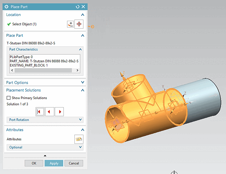 The following describes how to insert a PARTsolutions part using standard NX tools. In this example, the inserted part is connected to a manually created part (see Section 5.12.11.6.1, “Design parts in NX via path structure and "Stock" function”). (In placement dialog