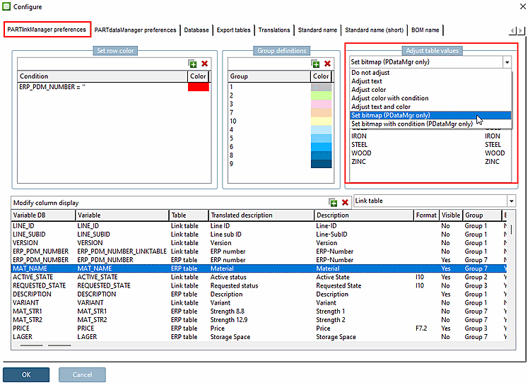 To simplify the selection of individual characteristics in the table ( PARTdataManager or PARTlinkManager ), it makes sense to use colors, images and conditions.