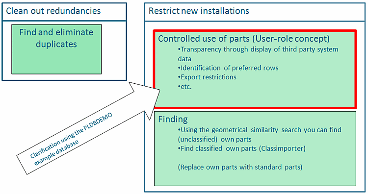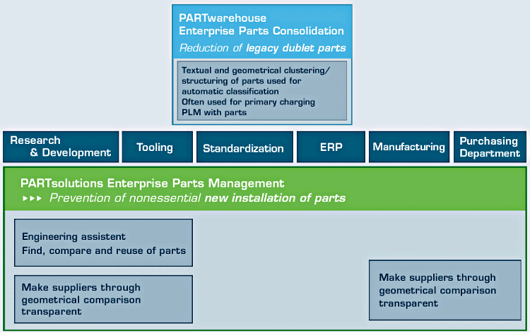 The following figure shows how the different stations of the value-added chain use PARTsolutions intelligent part management and PARTwarehouse intelligent part consolidation.