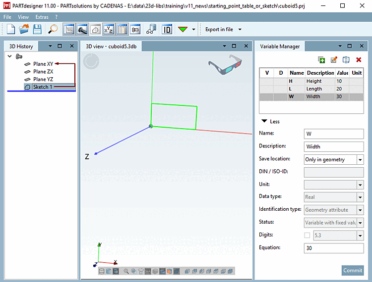 Create the variables L (Length), W (Width) and H (Height) for a cuboid in the variable manager [Variable Manager]. Details on the variable manager [Variable Manager] can be found at Section 7.8, “ Docking window " Variable manager" ”.
