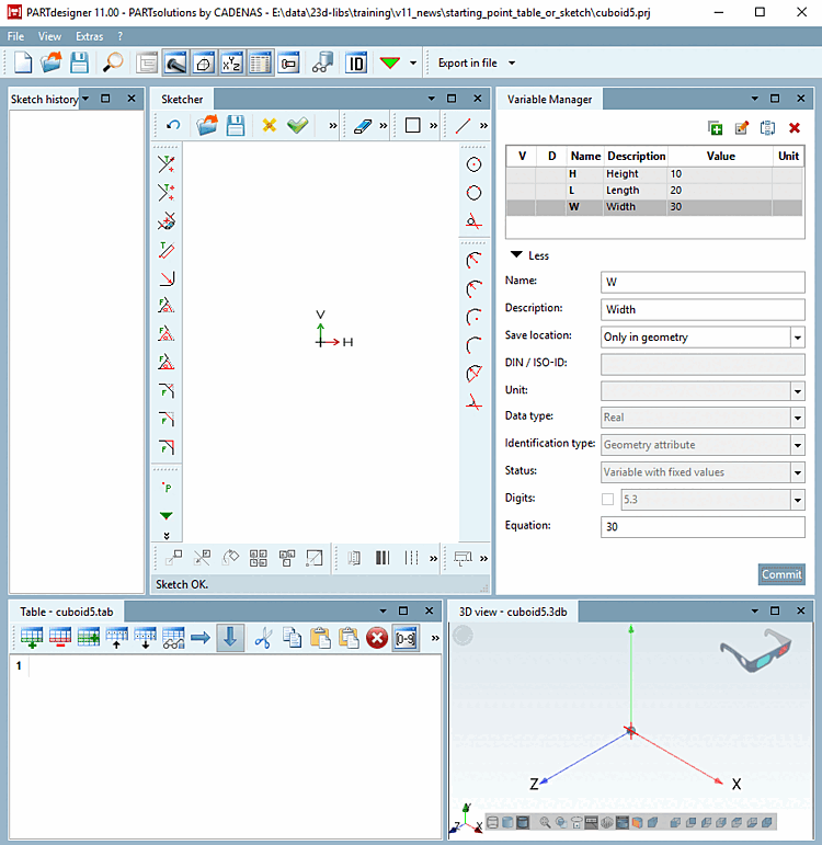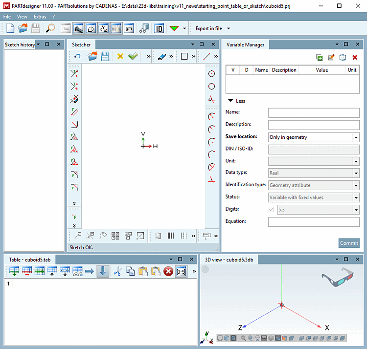 -> It opens PARTdesigner opens with the docking windows 3D History, 3D View [3D view], Variable Manager and Table.