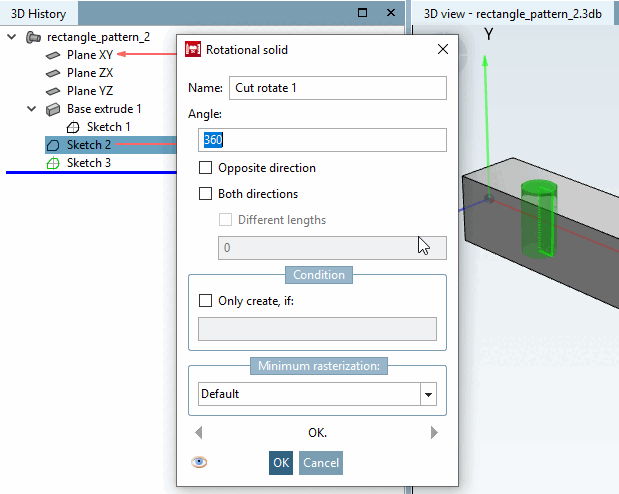 .Select the history point Cut Rotate (based on sketch with pattern origin [Pattern origin] ) and, holding down the Ctrl key, also the sketch containing the pattern points.
