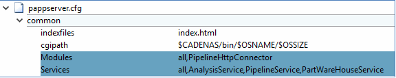 pappserver.cfgunder blockCommon, set the keyModulesto the valueall,PipelineHttpConnectorand the keyServicesto the valueall,AnalysisService,PartWareHouseService,PipelineService.Start the PARTapplicationServer with command input: