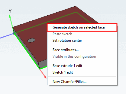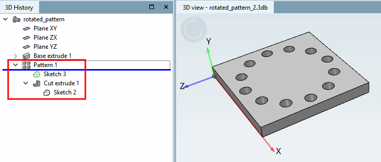 as it would otherwise be created twice. The base point is located in the other sketch.In the 3D history [3D History], select the Cut extrude construction steps and the sketch that contains the pattern (in the example, sketch 3 ) and click Create pattern in the context menu.