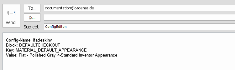 The button is only visible internally at CADENAS[33]. Clicking on the button opens a dialog window of the default e-mail application. The currently selected elements are already entered here. ConfigEditor" is entered as the subject.