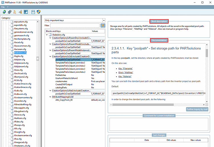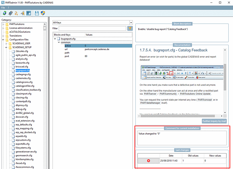 $CADENAS_SITESETUP/configEditorUserIo.xmlare saved.[34]In the Last changes dialog area, the last value changes of the currently selected key are listed with the date.