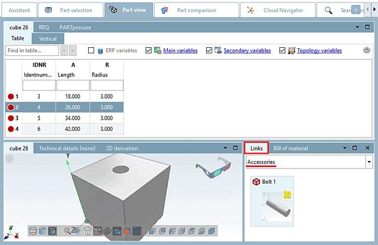 and open the part in PARTdataManager.In the Links docking window, select the Accessories list box option.