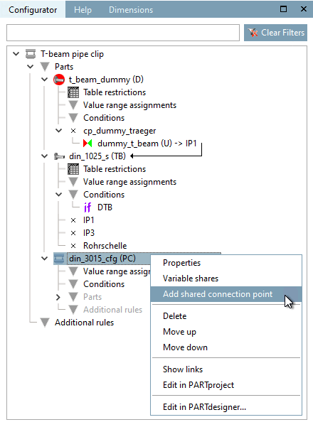 In the "Pipe clamp" context menu, click on Add release connection point [Add shared connection point].
