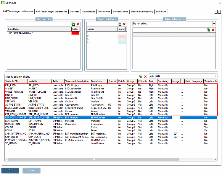 Details can be found under Section 4.9.7, “ Background color for ERP/PDM columns / plinkcommon.cfg -> Block [GROUP_COLORS] -> Key GROUP<number> ”