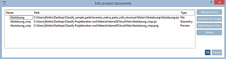On the Edit product documents [Edit documents in product] dialog page, you can add geometries, preview images and technical drawings.