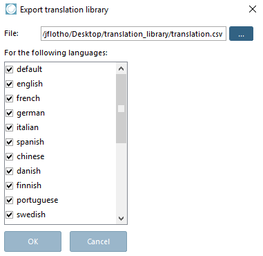 Export translations [Translate and Export]: The Export translation library dialog box opens. You can export all or just a selection of the created language files as a *.csv file. Specify the target storage location for this library in the File field.