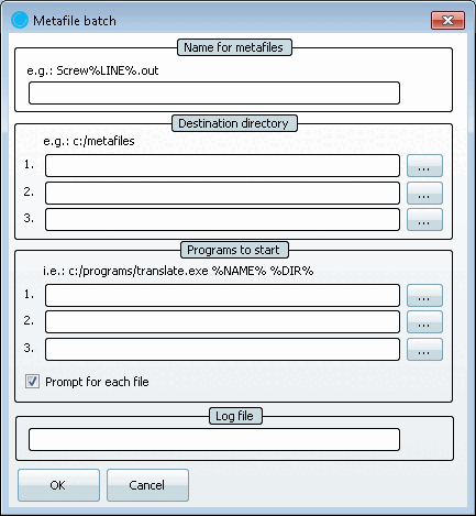 In the Programs to start field, you specify the program that is to be opened and the respective line content "processed" if necessary. %DIR% uses the last file passed, %NAME% takes the name of the respective file. If the Call for each file [Prompt for each file] option is activated, the program is always restarted with each line passed, otherwise it is only called once at the end of the batch.