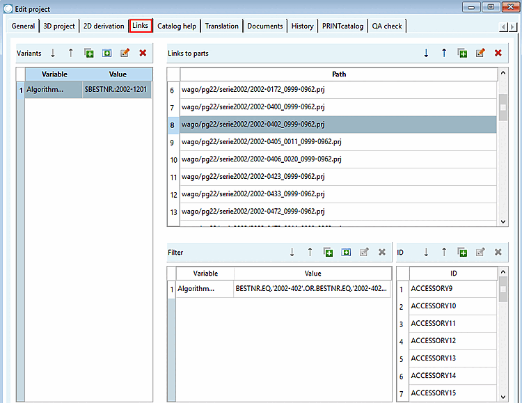 The Enrich catalog with accessory information [Enrich the catalog with accessory information] function offers the option of importing mapping information from a CSV file. In PARTproject the corresponding entries are then automatically set on the References [Links] tab page and the accessories are displayed in the final result in PARTdataManager are displayed in the final result.