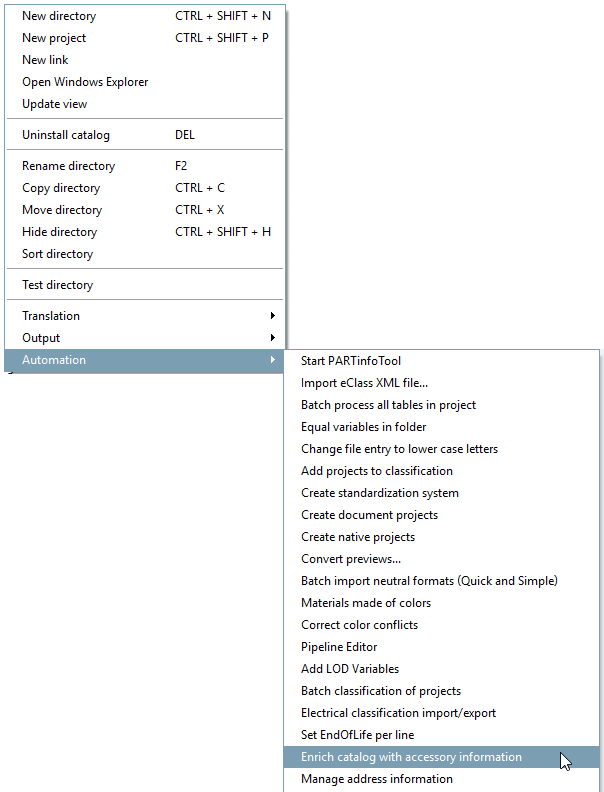 Select the desired directory in PARTproject the desired directory and click on the command Enrich catalog with accessory information [Enrich the catalog with accessory information].