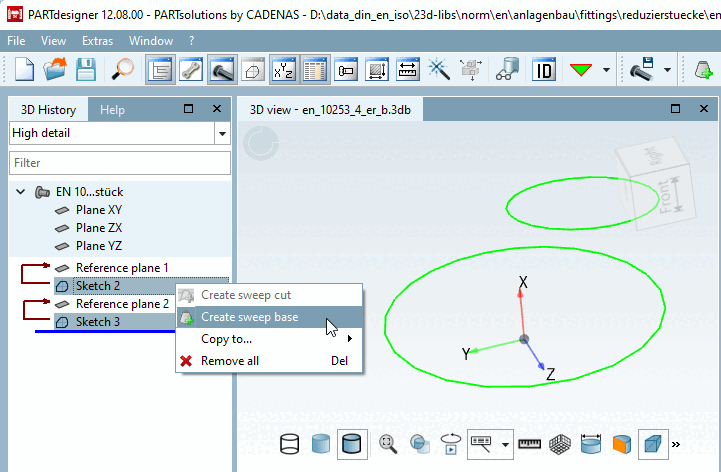 The sweep is created after marking two sketches using the context menu command Create basic sweep [Create sweep base] or Create section sweep [Create sweep cut].