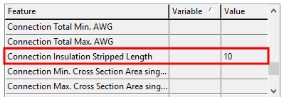 Scroll through the list of characteristics and enter the corresponding values for the characteristics connection type, stripping length and conductor connection cross-section, single-wire max. rated connection, as shown in the data sheet.