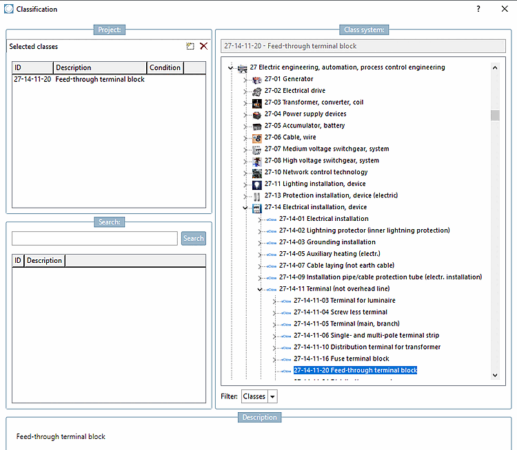 3. Select the correct component type (in this example a feed-through terminal block) and assign the class to the component by double-clicking. Confirm with OK.