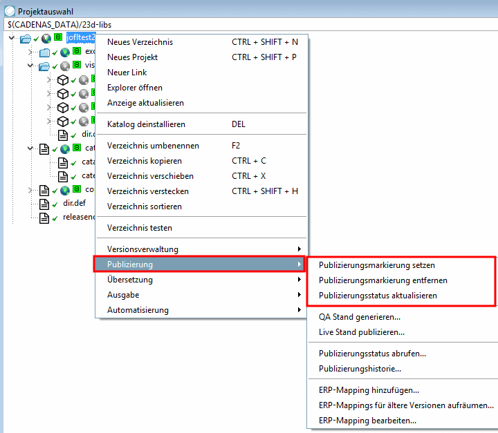 In order to prevent the display of projects (directories) in output media, they do not have to be removed, but it is sufficient to use the context menu command Remove publishing marker [Remove publication mark]. With Set publishing marker [Set publication mark], projects (directories) can in principle be designated for display in output media, whereby other factors also play a role.