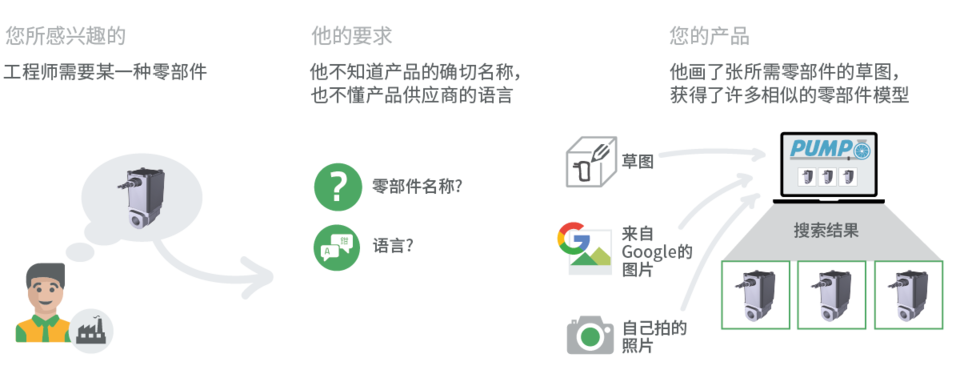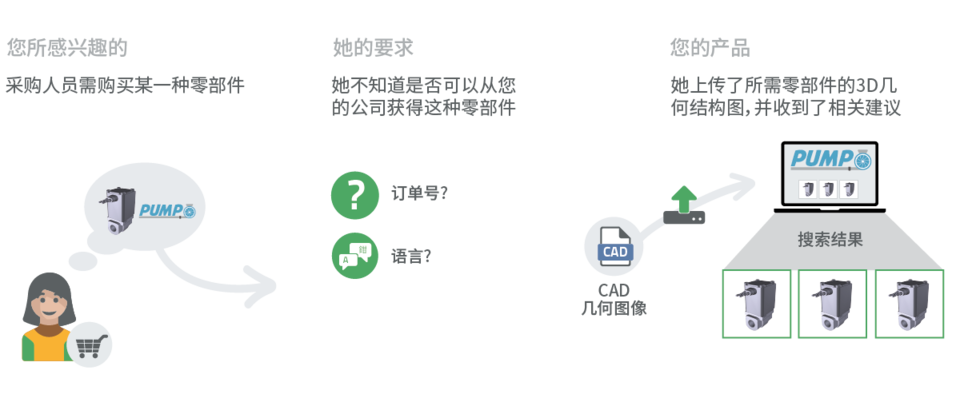 工程师、建筑师、专业规划师和采购人员通常情况下不太愿意使用制造商提供的产品名称、分类系统或编码系统。通过几何相似性搜索,您的客户可以简单地将所需零部件作为3D图像上传,并从系统直接接收反馈,是否此零部件是适合的,以及是否可以实际订购此零部件。