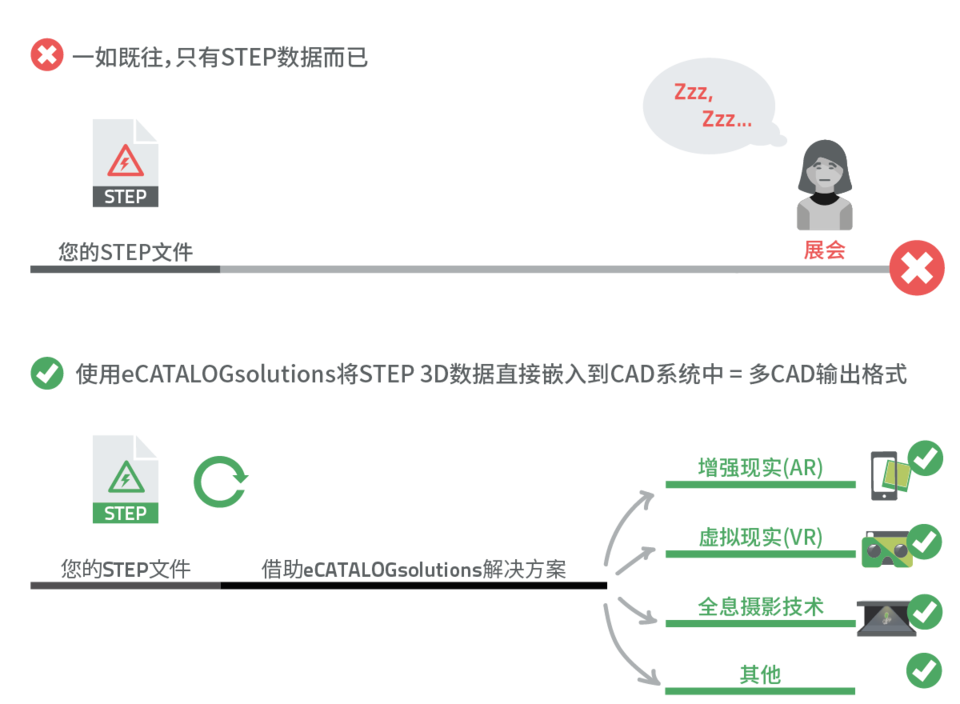 无论是增强现实、虚拟现实还是全息摄影技术,借助eCATALOGsolutions来展示您产品的3D STEP / CAD数据模型,会吸引更多的参观者,让您的产品令人过目不忘。